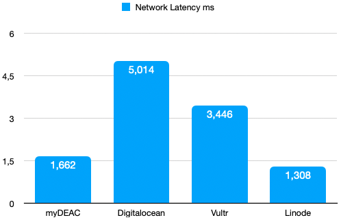To ensure accurate cost comparison, we’ve standardized the pricing by converting the cost of myDEAC, which is listed in Euros, to USD, thus matching the currency used by DigitalOcean, Linode, and Vultr. Please note, the prices we’re comparing are exclusive of VAT.